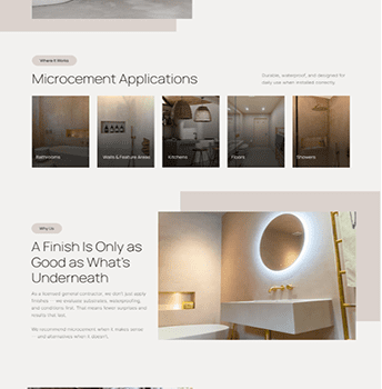 The layout emphasizes clarity and education, breaking down what microcement is, where it works, and why professional installation matters. I structured the page with strong messaging, a clear process section, trust indicators, and strategic CTAs to encourage consultation requests.