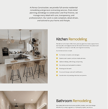 I designed a complete multi-page website for Renoa Design & Construction, following a defined scope tailored for newly established construction companies. The site structure mirrors proven layouts used in similar remodeling businesses while maintaining a unique visual identity.